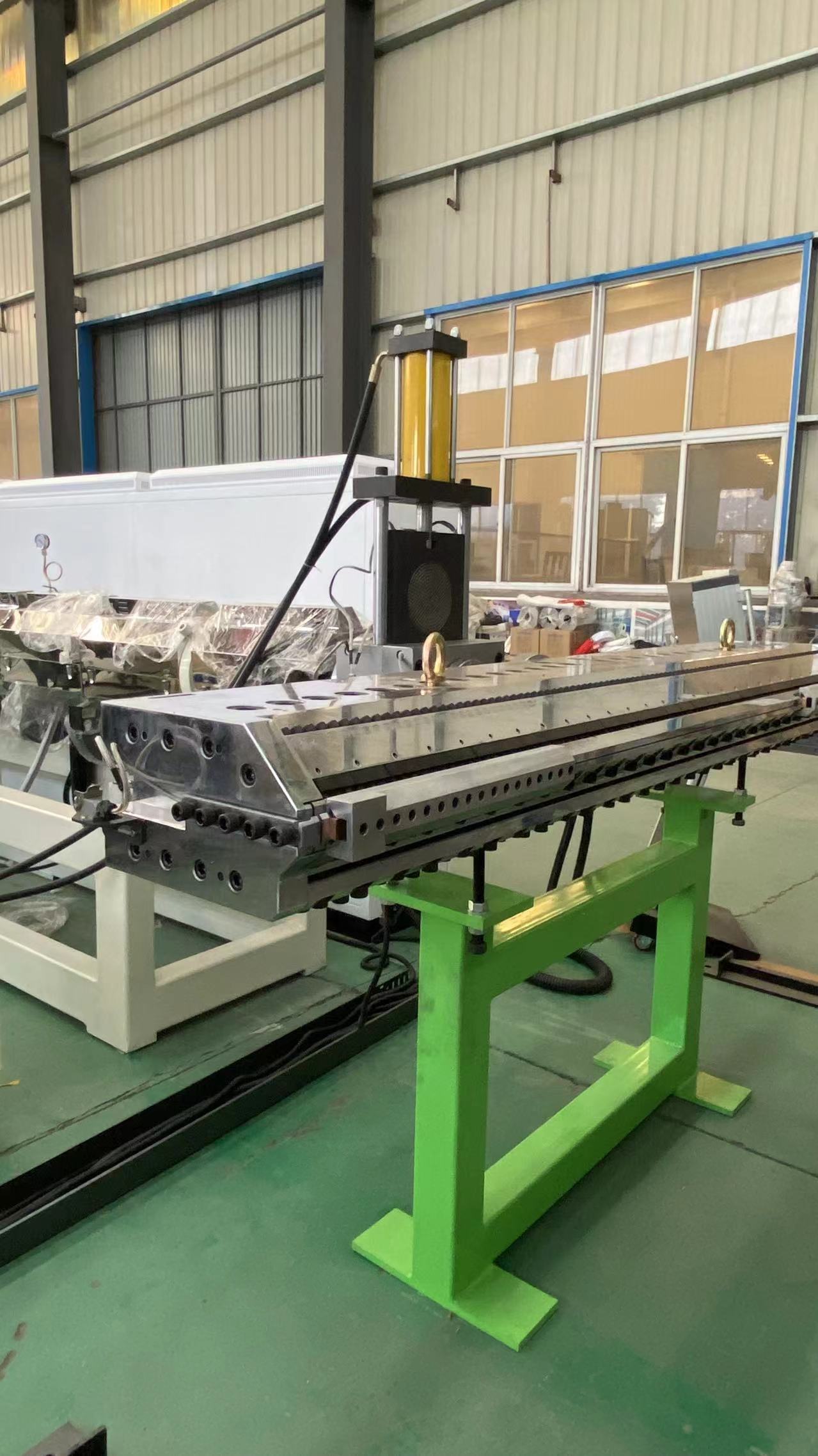 Die ProduktionslinieDer Verbunddüsenkopf von verfügt über eine T-förmige Struktur und ist aus P20-Formstahl mit einer Fließkanaloberflächenrauheit von Ra 0,05 μm gefertigt. Der Düsenkopf verfügt über neun Heizzonen, eine Heizleistung von 27 kW und eine maximale Produktionsbreite von 1.300 mm und ermöglicht so eine präzise Steuerung der Dicke und Ebenheit der extrudierten PE-Kernschicht. Der Dreiwalzenkalander hat eine effektive Arbeitsflächenabmessung von 500 × 1.500 mm. Die Liniengeschwindigkeit kann mithilfe eines variablen Geschwindigkeitsregelsystems von ABB präzise von 0,5 bis 8 m/min eingestellt werden, um eine glatte Blechoberfläche zu gewährleisten.