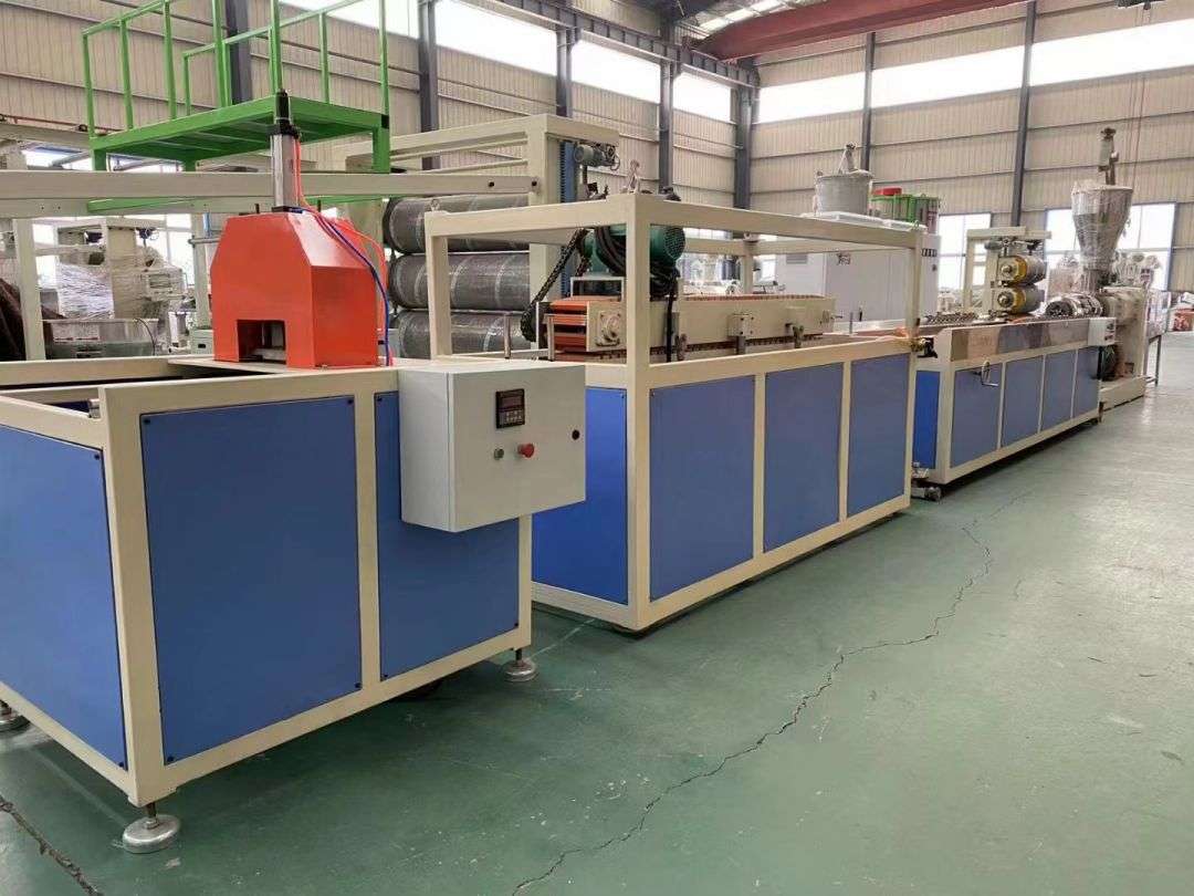 Die Profilproduktionslinie verwendet konische Doppelschneckenextruder der Serie SJSZ-65/132, Vakuumformplattformen aus Edelstahl, Raupentraktoren, integrierte automatische Schneidmaschinen und umklappbare Entladegestelle. Die Formplattform ist mit einer Hochdruck-Vakuumpumpe und einer Wasserpumpe ausgestattet, die vierdimensional verstellbar sind. Der Traktor wird pneumatisch geklemmt. Die automatische Festlängen-Schneidemaschine verwendet einen Fahrschalter, um auf eine feste Länge zu schneiden. Das Stapelgestell ist 6 Meter lang, besteht aus Edelstahl und wird pneumatisch gewendet.