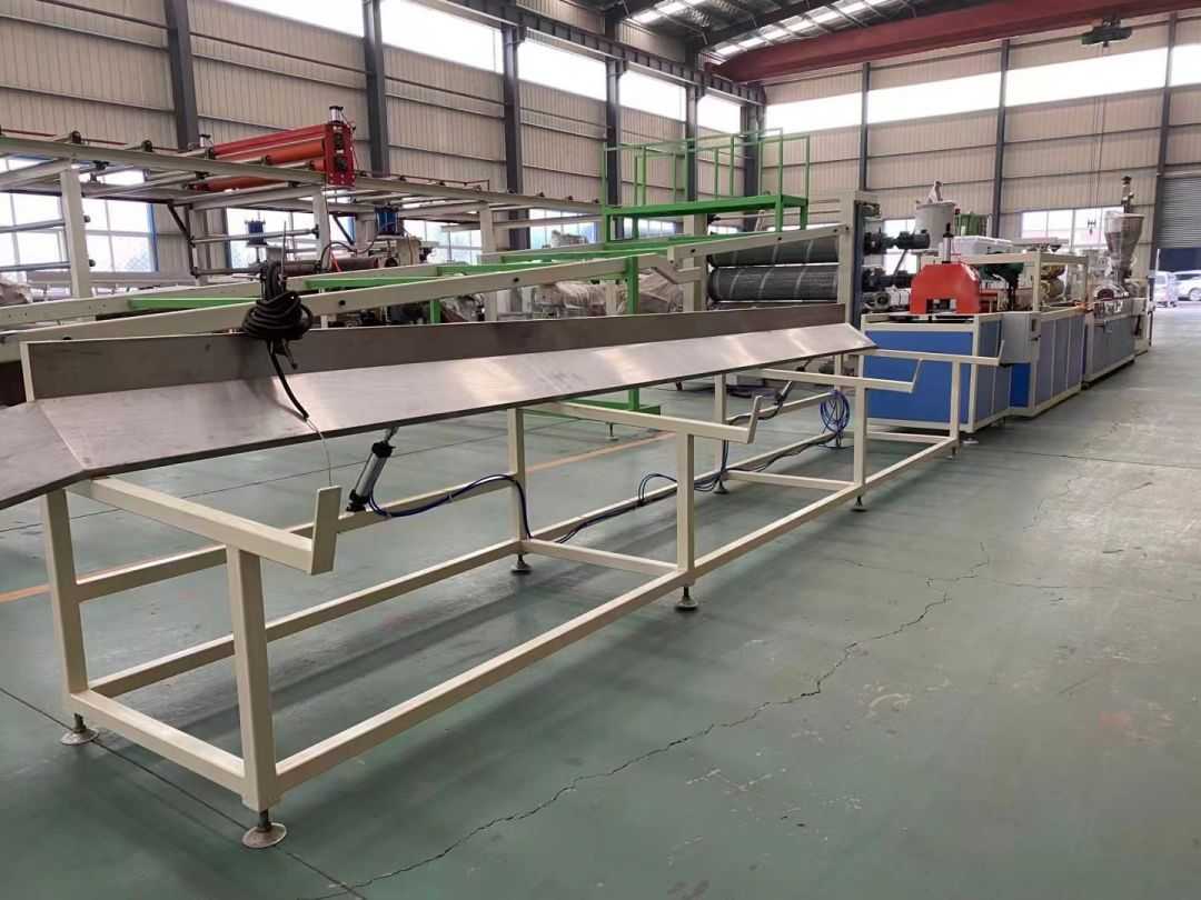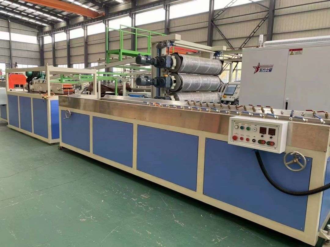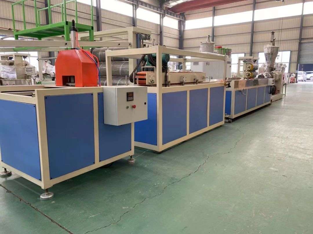 Profilproduktionslinie Die Profilproduktionslinie verwendet konische Doppelschneckenextruder der Serie SJSZ-65/132, Vakuumformplattformen aus Edelstahl, Raupentraktoren, integrierte automatische Schneidmaschinen und umklappbare Entladegestelle. Die Formplattform ist mit einer Hochdruck-Vakuumpumpe und einer Wasserpumpe ausgestattet, die vierdimensional verstellbar sind. Der Traktor wird pneumatisch geklemmt. Die automatische Festlängen-Schneidemaschine verwendet einen Fahrschalter, um auf eine feste Länge zu schneiden. Das Stapelgestell ist 6 Meter lang, besteht aus Edelstahl und wird pneumatisch gewendet.