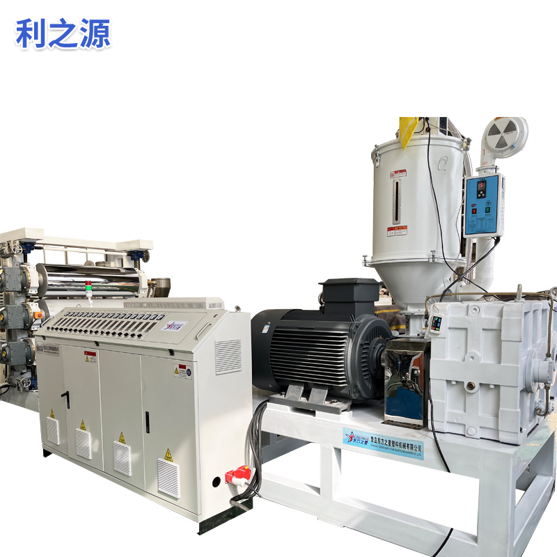 Extruderausrüstung für Weich-PVC-Antirutschplatten: Die Ausrüstung besteht hauptsächlich aus einem Einschneckenextruder, einem Dreiwalzenkalander und einer 6-Meter-Kühlung Halterung, eine Gummiwalzen-Traktionsmaschine, eine Schermaschine und ein Förderbandgerät.