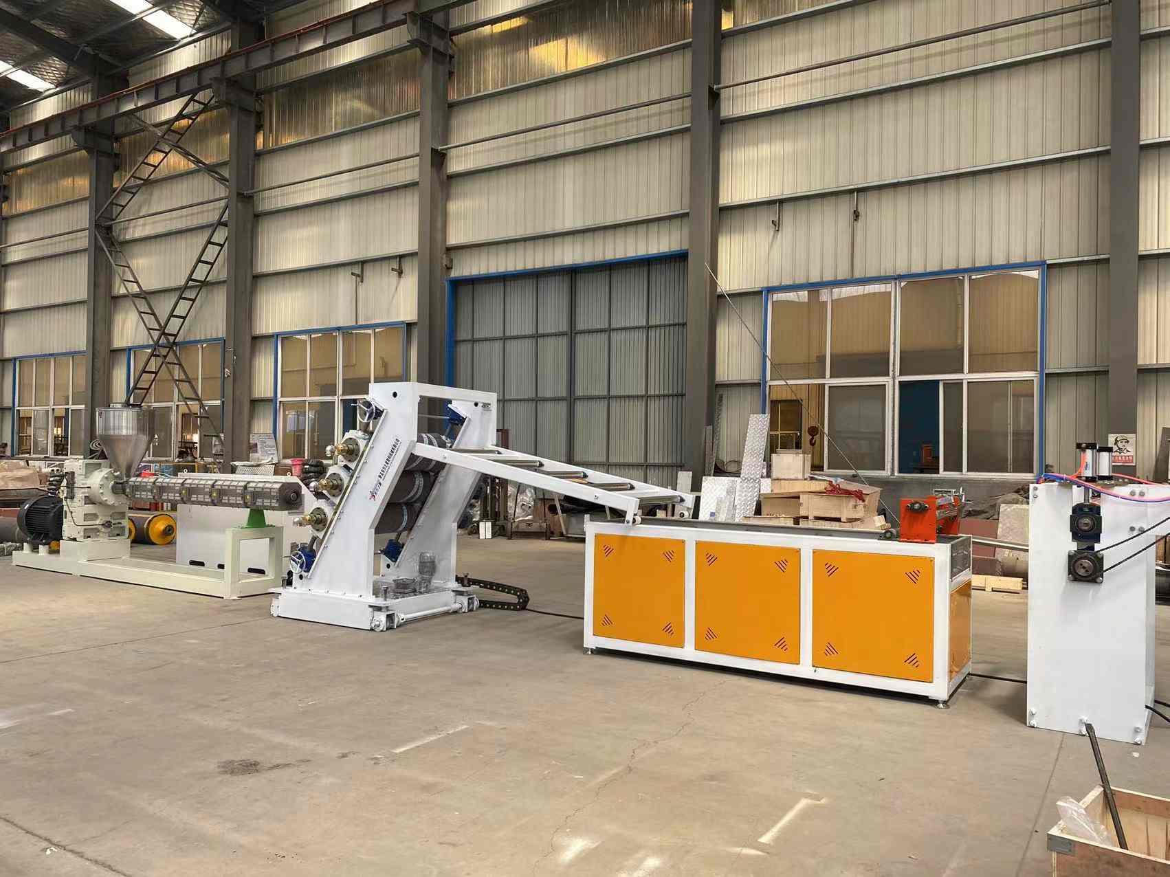 Produktionslinie für transparente weiche PVC-Türvorhänge: Kann transparente PVC-Kunststoffplatten mit einer Breite von 200 bis 600 Millimetern und einer Dicke von 0,8 bis 3 Millimetern herstellen. Die Ausrüstung umfasst einen SJ90- oder SJ-120-Einschneckenextruder, eine einstellbare T-förmige flexible Düse, einen vertikalen oder um 45 Grad geneigten Dreiwalzenkalander, einen Drei-in-Eins-Wassertemperaturregler, eine Kühlhalterung aus Edelstahl mit einem breit verstellbaren Trimmmesser, eine Gummiwalzen-Traktionsmaschine und einen Luftexpansionswellenwickler mit zwei Positionen. Die hergestellten Platten haben eine glänzende Oberfläche, hohe Transparenz, Weichheit, keine Risse, keinen Geruch, keine Blasen und sind flexibel, kältebeständig, verschleißfest, säure-alkalibeständig und korrosionsbeständig.