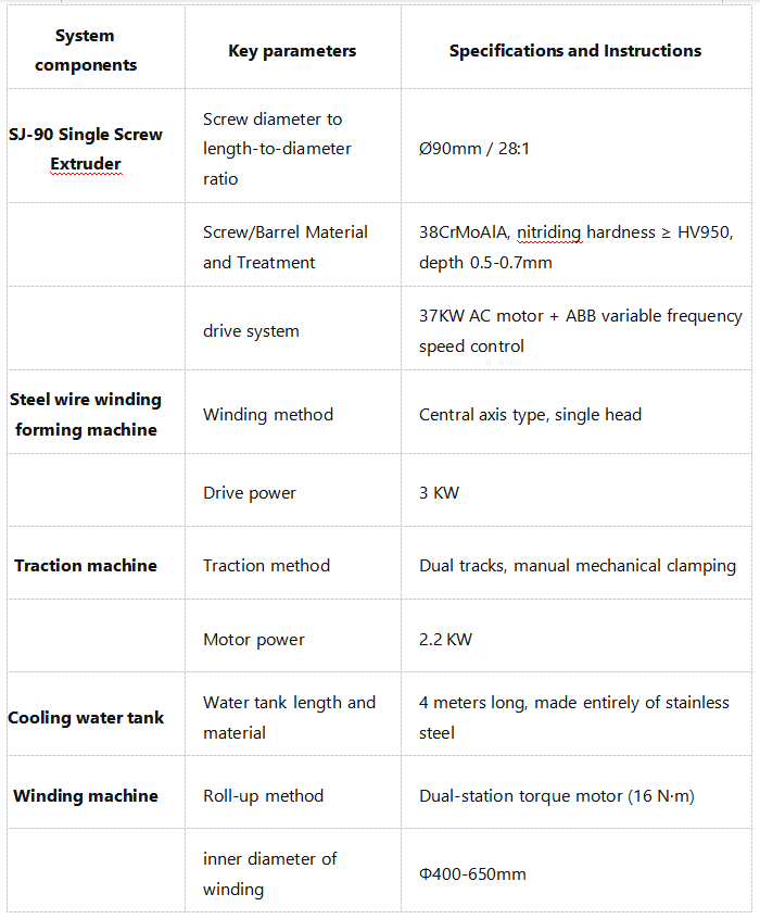 Leistungsstarke Plastifizierung, dichte Beschichtung: Der SJ-90-Extruder verfügt über eine für das L/D-Verhältnis von 28:1 optimierte Schnecke, die eine gleichmäßige PVC-Plastifizierung gewährleistet; In Kombination mit einer Präzisionsbeschichtungsdüse wird eine 360°-perfekte Beschichtung des Stahldrahts ohne tote Winkel erreicht, wodurch Drahtbrüche und Luftlecks vermieden werden.